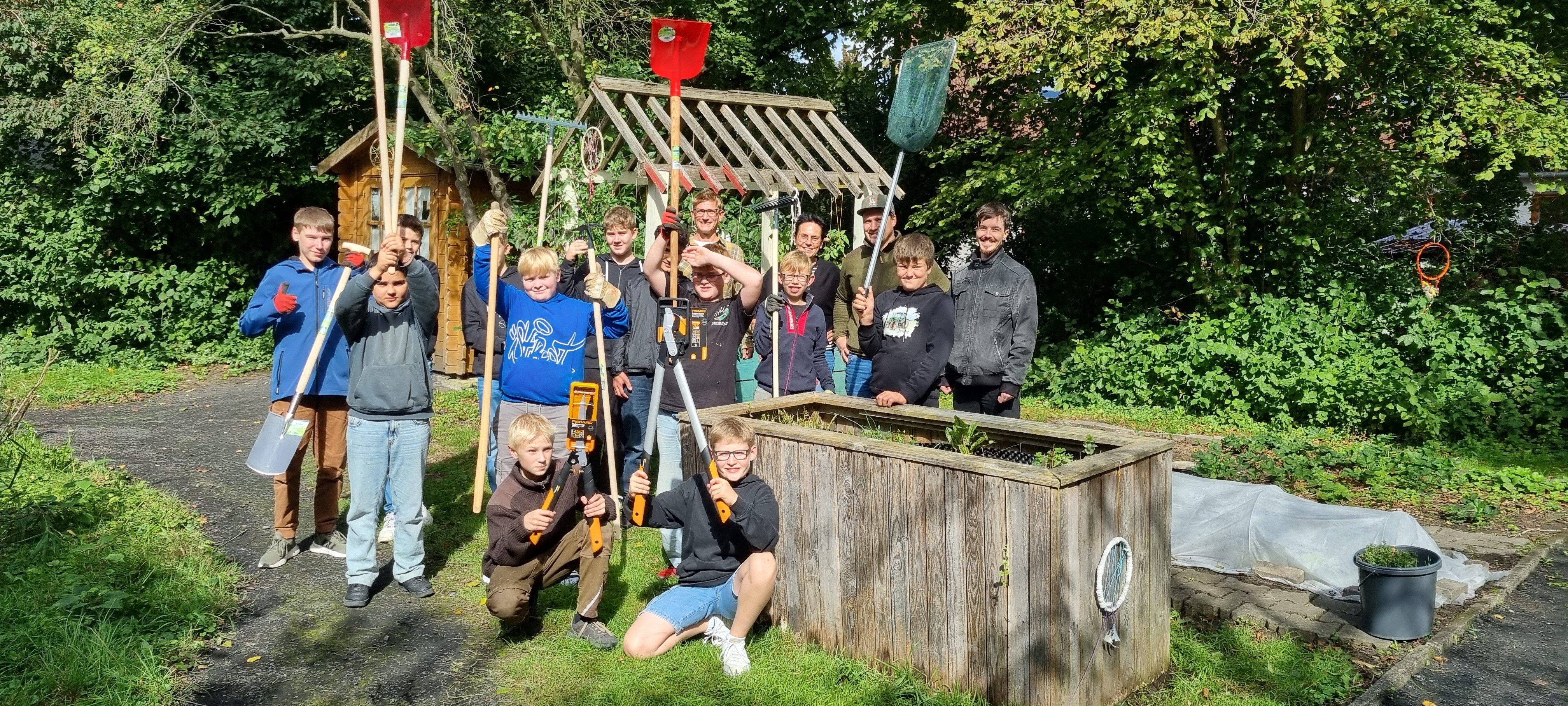 Zusammen mit einigen Schülerinnen und Schülern nahmen die Lehrkräfte Marietta Stapper und Marcus Kunz von der Sekundarschule am Montag neue Werkzeuge für die Pflege des Schulgartens entgegen. Pass...