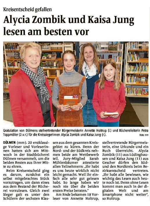 Die beste Vorleserin des Kreises Coesfeld ist mit Alycia Zombik eine Schülerin der Sekundarschule Lüdinghausen. Am "Bundesweiten Vorlesewettbewerb des deutschen Buchhandels" unter Schirmherrschaft ...