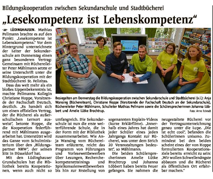 Unter dem Dach der "Bildungspartner NRW" wurde gestern ein Kooperationsvertrag zwischen der Stadtbücherei St. Felizitas und der Sekundarschule Lüdinghausen unterzeichnet. Im Rahmen der Zusammenarbe...