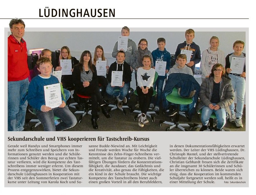 In Kooperation mit der VHS hat die Sekundarschule im Bereich der freiwilligen Zusatzangebote zwei Tastaturschreibkurse unter Leitung von Karola Koch und Susanne Budde-Niewind angeboten. 30 Schülerin...