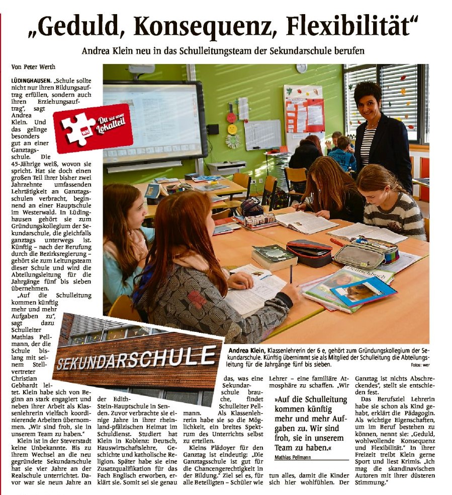 Das Leitungsteam der Sekundarschule Lüdinghausen wird größer: Die Stelle der Abteilungsleiterin (5-7) wurde zum 01. Dezember 2016 mit Frau Andrea Klein besetzt. Frau Klein ist als Mitglied des Grü...