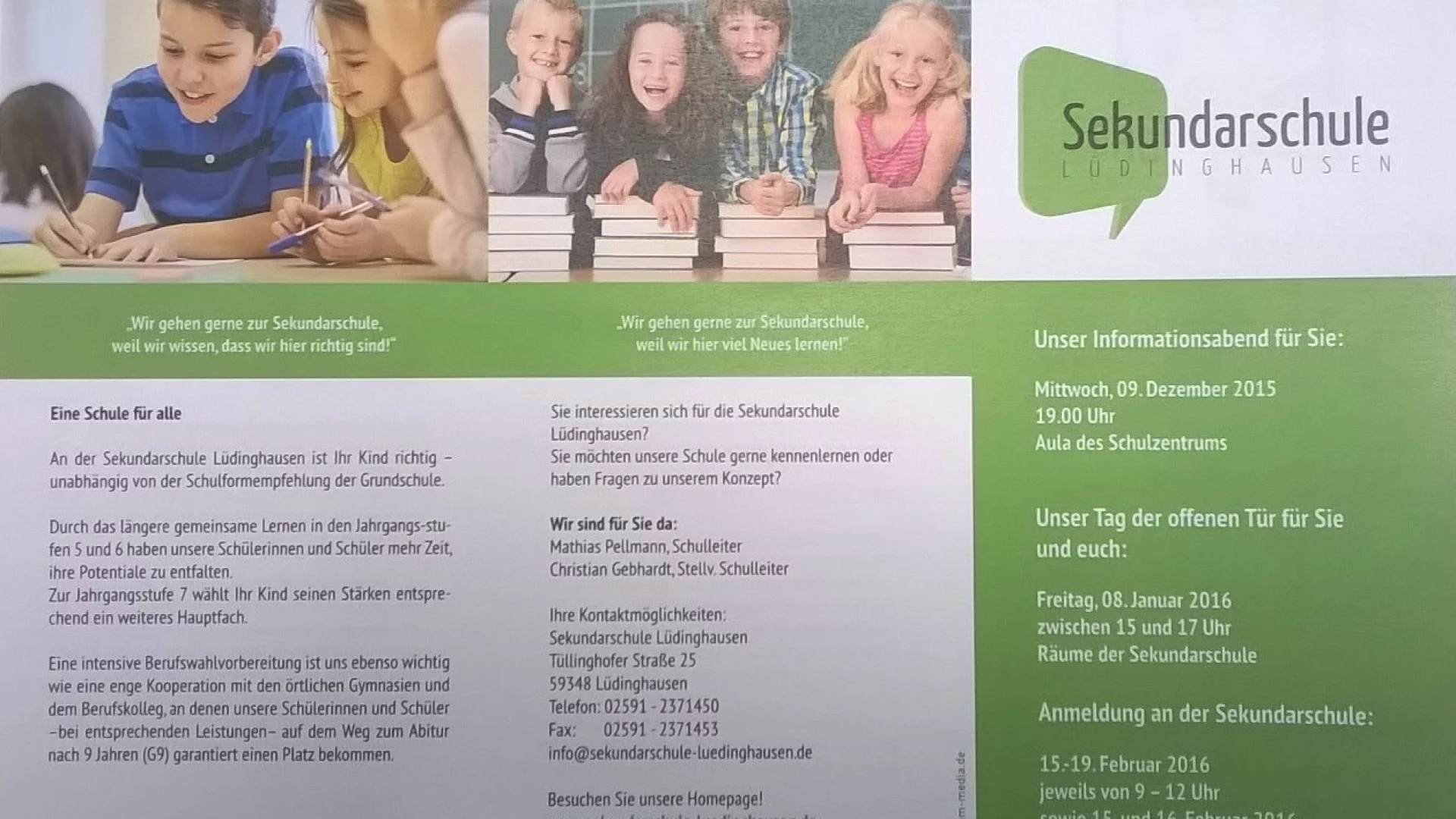 Sie möchten sich über die Sekundarschule Lüdinghausen informieren? Sie interessieren sich für Informationsveranstaltungen und Anmeldetermine? Unsere neue Informationsbroschüre befindet sich im Druck und wird spätestens zum Beginn der nächsten Woche (26.Oktober) hier bei uns und an den örtlichen Grundschulen vorliegen. Sie möchten nicht so lange warten? Im Bereich "Download" finden Sie die Broschüre schon jetzt als PDF.