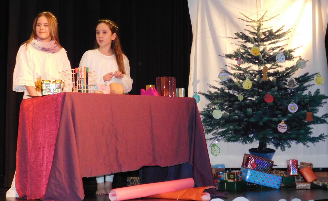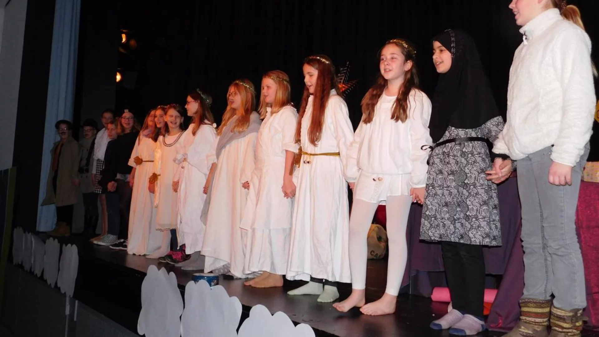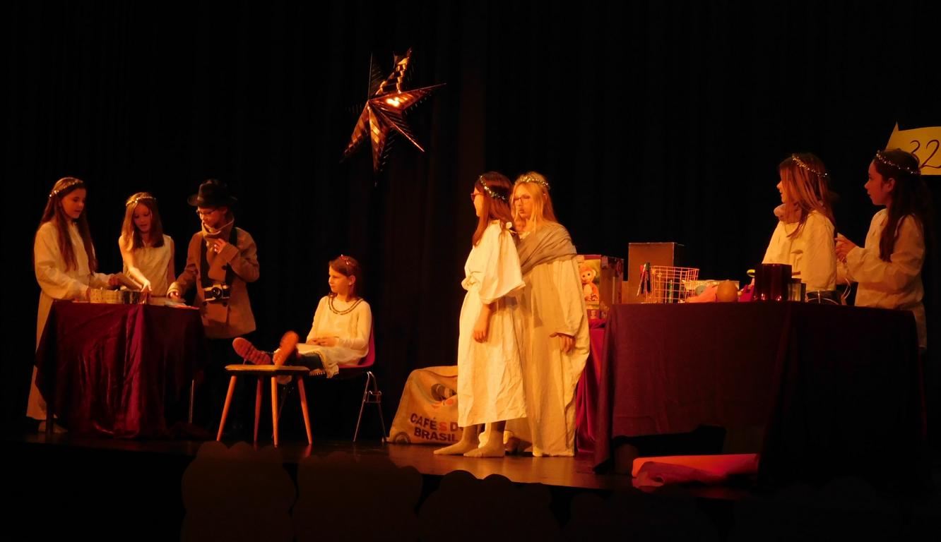 Eine fantastische Premiere zeigte die Gruppe vom Wahlmodul "Theater" heute vor allen Schülerinnen und Schülern und vielen Eltern auf der großen Bühne der Aula des Schulzentrums. Unter der Leitung von Lehrerin Frederike Bröer präsentierten die jungen Schauspielerinnen und Schauspieler das in Teilen selbst verfasste, spannende Theaterstück "Der geheime Spind". Ein verlorener Wunschzettel löst hier eine Reihe von Ereignissen aus, die bei den Weihnachtsengeln im Himmel zum Einsatz von Detektiven führen. Neben der Spielfreude und Textsicherheit der Akteure fiel auch das liebevoll gestaltete, selbst hergestellte Bühnenbild auf. Ein herzliches Dankeschön an alle Beteiligten!