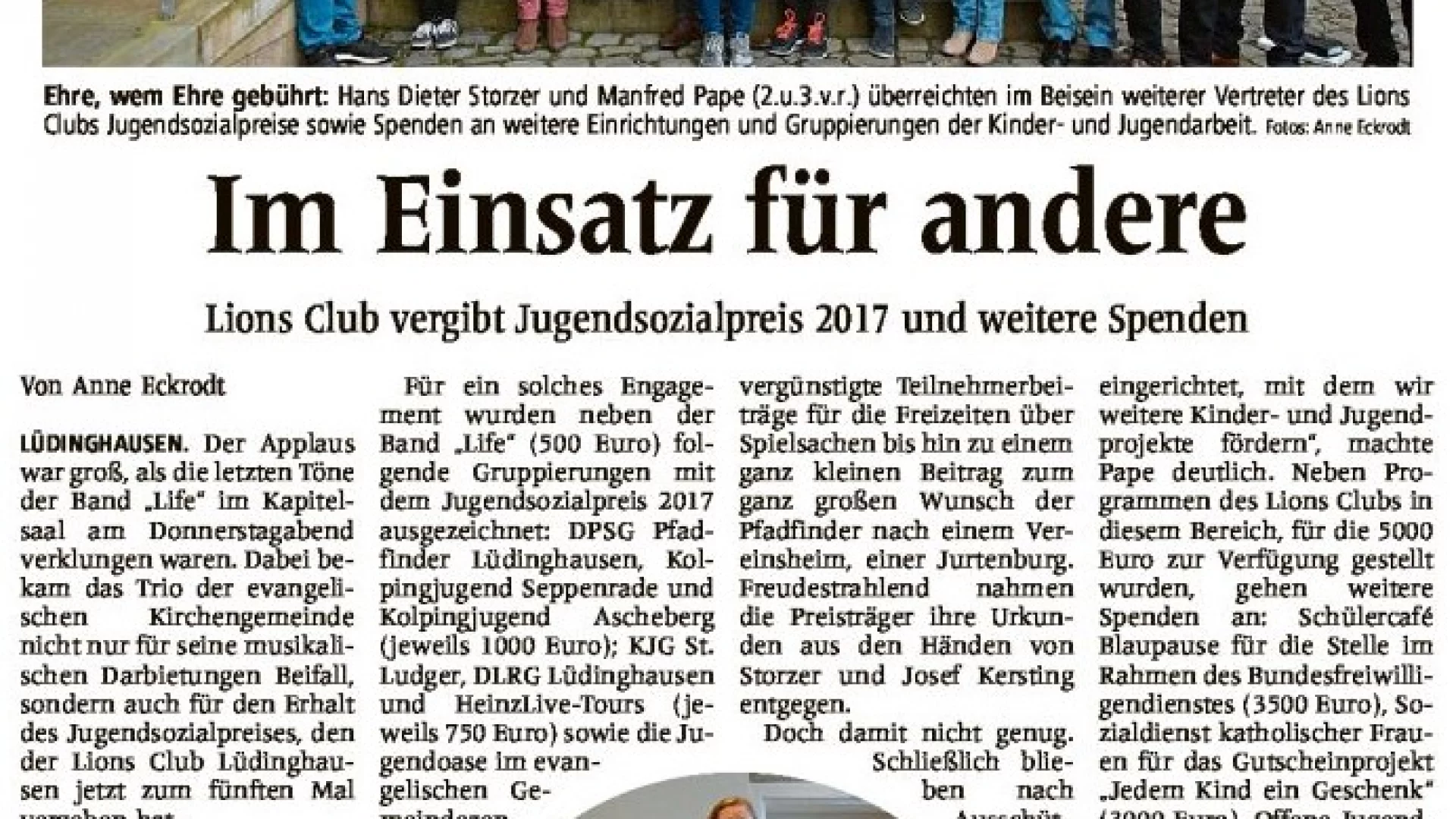 Der Lions-Club Lüdinghausen hat im Rahmen des Jugendsozialpreises auch die Sekundarschule bedacht: 250 Euro erhielt die "Sozial Genial"-Gruppe im Rahmen einer Feierstunde im Kapitelsaal der Burg Lüdinghausen. Unter Leitung von Jutta Nolte hatten die Schülerinnen und Schüler mit verschiedenen Projekten Geld erwirtschaftet, welches den "Tierfreunden Lüdinghausen" gespendet wurde. Herzlichen Glückwunsch zu diesem tollen Erfolg und vielen Dank an die Lions!