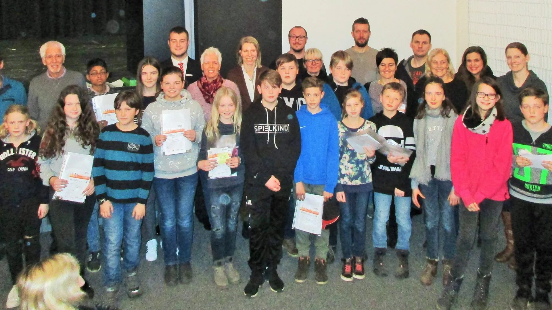 Sekundarschüler sind sportlich: 155 Schülerinnen und Schüler erhielten heute in der Aula des Schulzentrums von Klaus Becker, dem Sportabzeichenbeauftragten des Landes NRW im Kreis Coesfeld und dem stellvertretenden Schulleiter Christian Gebhardt ihre Urkunden und Abzeichen. Auch Yannik Deiters von der Sparkasse Westmünsterland, welche den Erwerb des Sportabzeichens tatkräftig unterstützt, beglückwünschte die Schülerinnen und Schüler zu ihren Leistungen. Auch das Kollegium war nicht untätig: 18 Lehrerinnen und Lehrer haben das Sportabzeichen im Rahmen einer Kollegiumsveranstaltung im Stadion erworben.