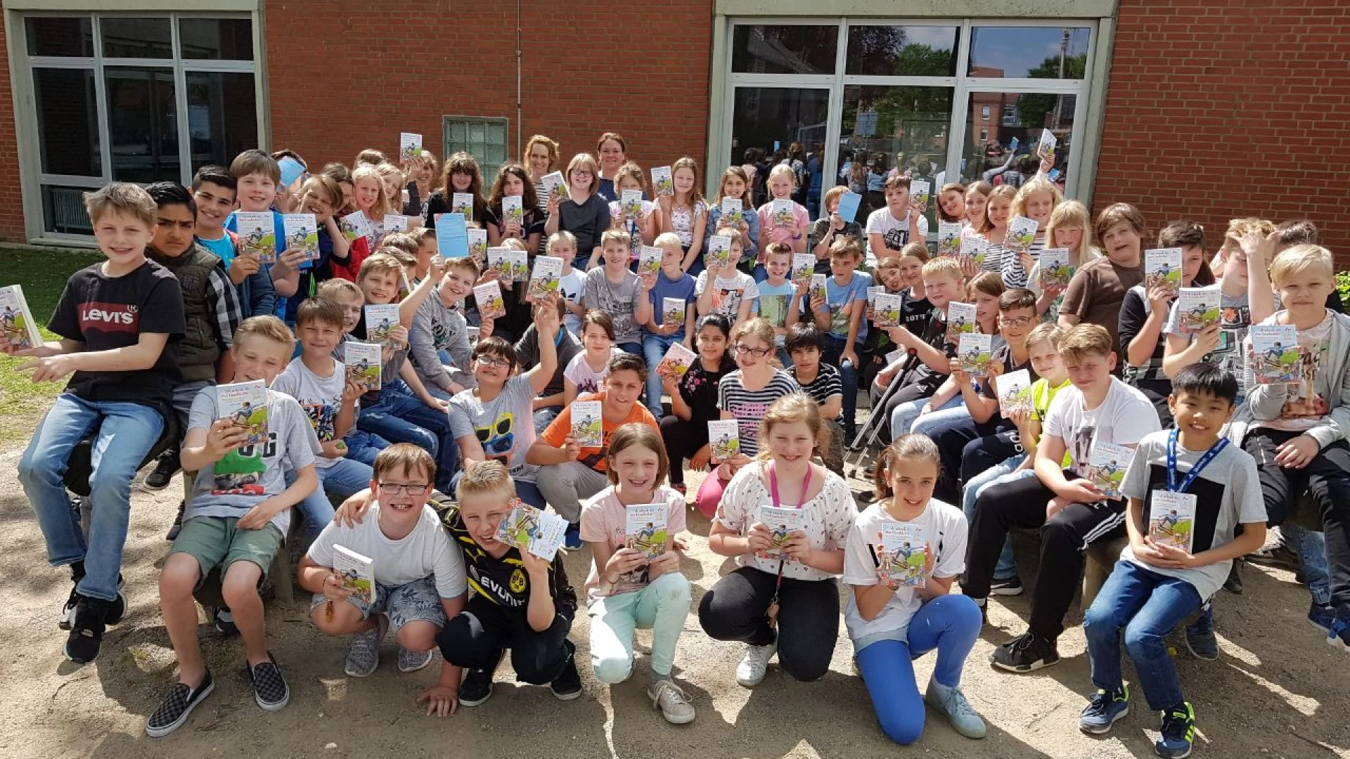 In der Steverbuchhandlung war gestern die Jahrgangsstufe fünf zu Gast. Nach einer Quizrallye durch die Stadt erhielten dort alle Schülerinnen und Schüler das Buch "Lenny, Melina und die Sache mit dem Skateboard". Seit 1997 geben die Stiftung Lesen und der cbj-Verlag jedes Jahr zum Welttag des Buches einen neuen Titel der Buch-Reihe "Ich schenk dir eine Geschichte" heraus. Die Bücher werden eigens zu diesem Zweck von bekannten Kinderbuchautoren geschrieben und richten sich inhaltlich an der Lebenswelt der Zielgruppe aus. Die Teilnahme an der Aktion ist einer von vielen Bausteinen an der Sekundarschule, mit denen die Lesefreude und Lesekompetenz gefördert werden.