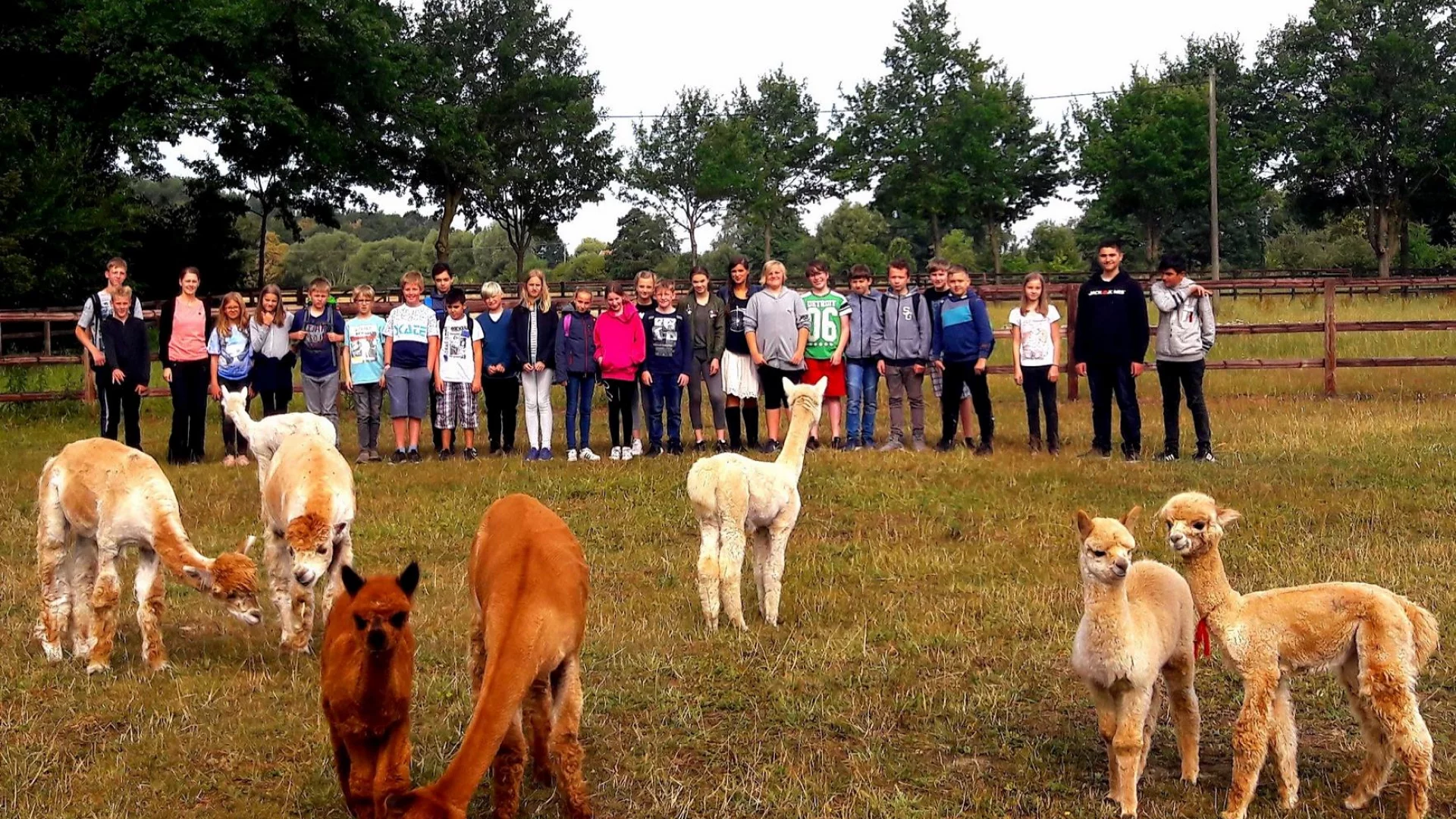 In der letzten Schulwoche ist eine Menge los an der Sekundarschule. Jede Klasse befasst sich im Rahmen einer Projektwoche mit einem Land, das an der Fußball-WM teilnimmt. Der Kreativität sind keine Grenzen gesetzt: Es wird gebastelt, gesungen, gekocht und getanzt. Auch Ausflüge gibt es: Das Bild zeigt die Klasse 6E, die sich mit Peru befasst, auf dem Alpakahof in Aldenhövel. Beendet wird die Projektwoche mit einem Fußballturnier im Stadion, bei dem auch die Produkte der Woche präsentiert werden.