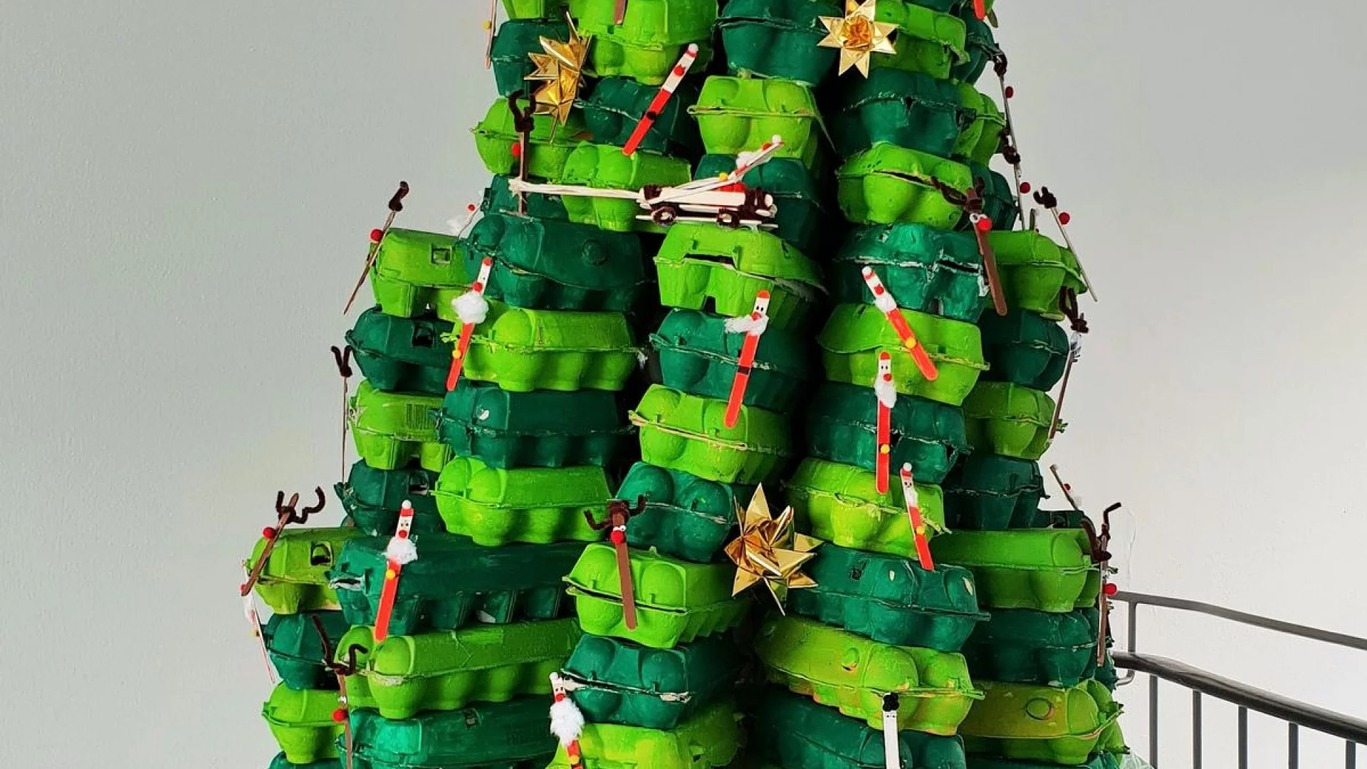 Das Bild zeigt den "Upcycling-Weihnachtsbaum", den die Klasse 6c von Frau Daldrop und Herrn Leefers in Zusammenarbeit mit Schulsozialarbeiterin Silke Brutzki geschaffen hat.