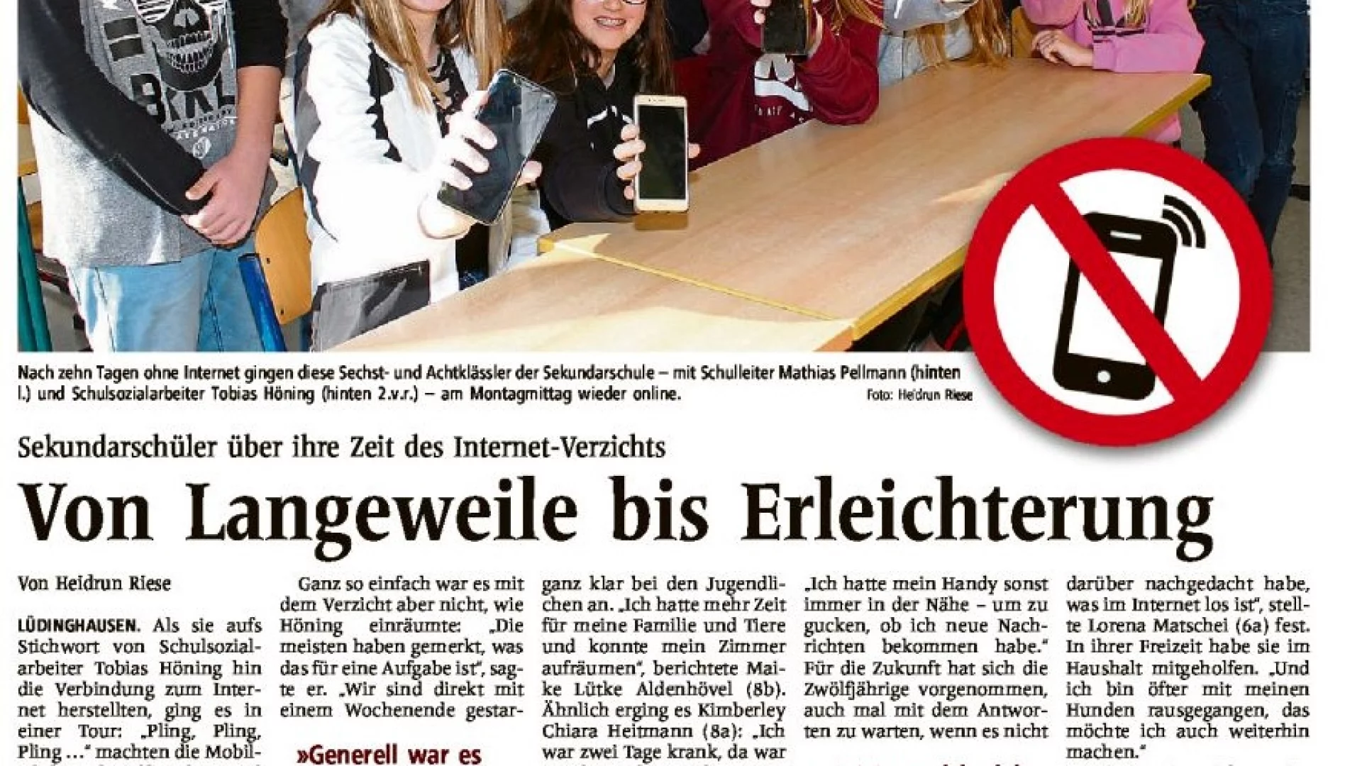 Können Jugendliche 10 Tage lang ohne Internet, ohne WhatsApp, Snapchat und Instagram überleben? Dieser Herausforderung stellte sich eine Gruppe von Schülerinnen und Schülern der Jahrgangsstufen 6 und 8 mit Schulsozialarbeiter Tobias Höning. Die Antwort: Es geht! Welche positiven Erfahrungen die Jugendlichen machten und was sie schmerzlich vermissten, klönnen Sie dem Artikel der Westfälischen Nachrichten entnehmen.