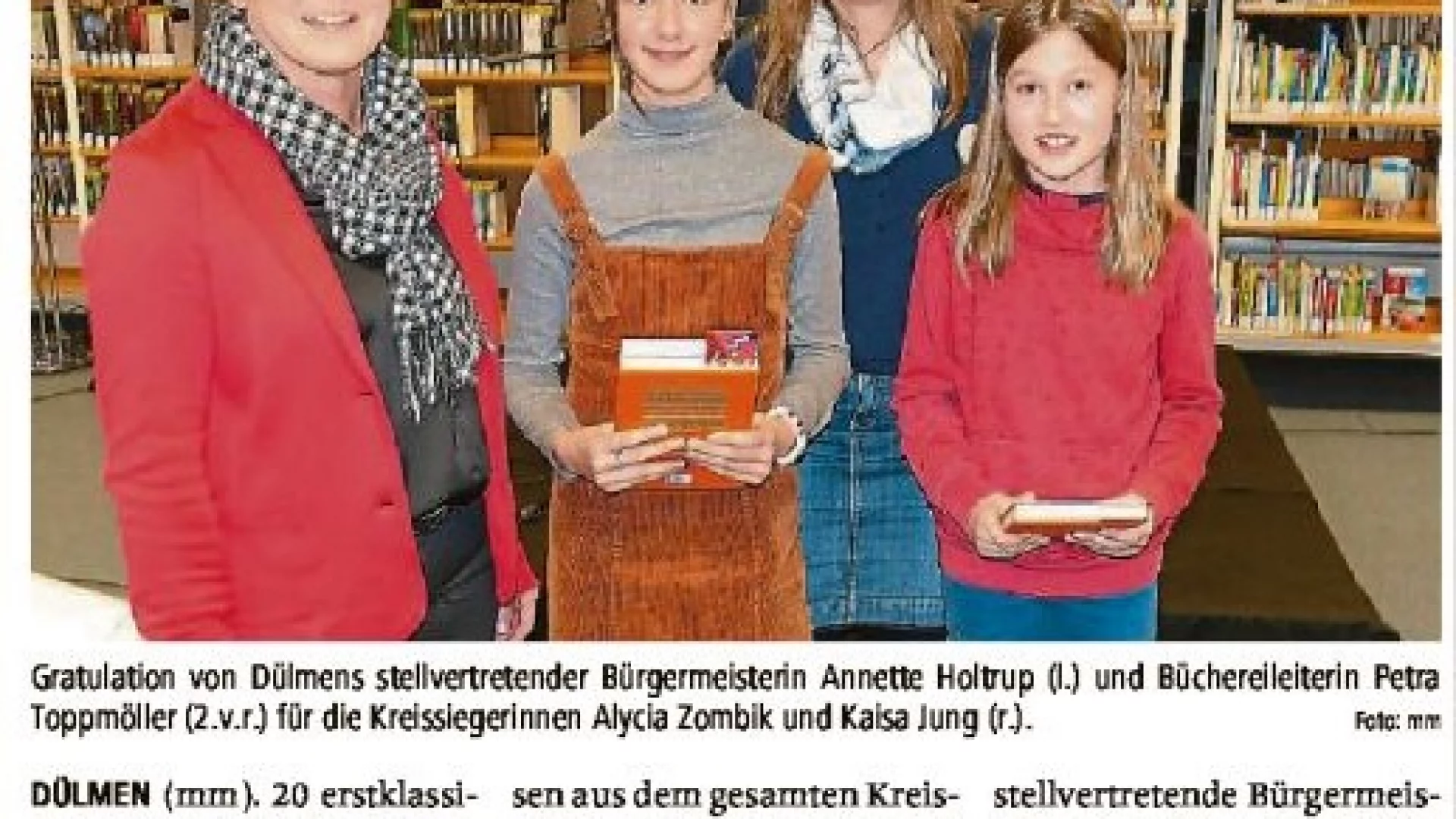 Die beste Vorleserin des Kreises Coesfeld ist mit Alycia Zombik eine Schülerin der Sekundarschule Lüdinghausen. Am "Bundesweiten Vorlesewettbewerb des deutschen Buchhandels" unter Schirmherrschaft des Bundespräsidenten nehmen alljährlich etwa 600.000 Schülerinnen und Schüler teil. Im Dezember war Alycia in den Räumen der Stadtbücherei zur besten Vorleserin der Sekundarschule gekürt worden und qualifizierte sich somit zum Vorlesewettbewerb auf Kreisebene. In Dülmen waren dann die jeweils besten Vorlesenden der weiterführenden Schulen aller Schulformen des Kreises eingeladen, die Kreissiegerin zu ermitteln. Herzlichen Glückwunsch, Alycia!