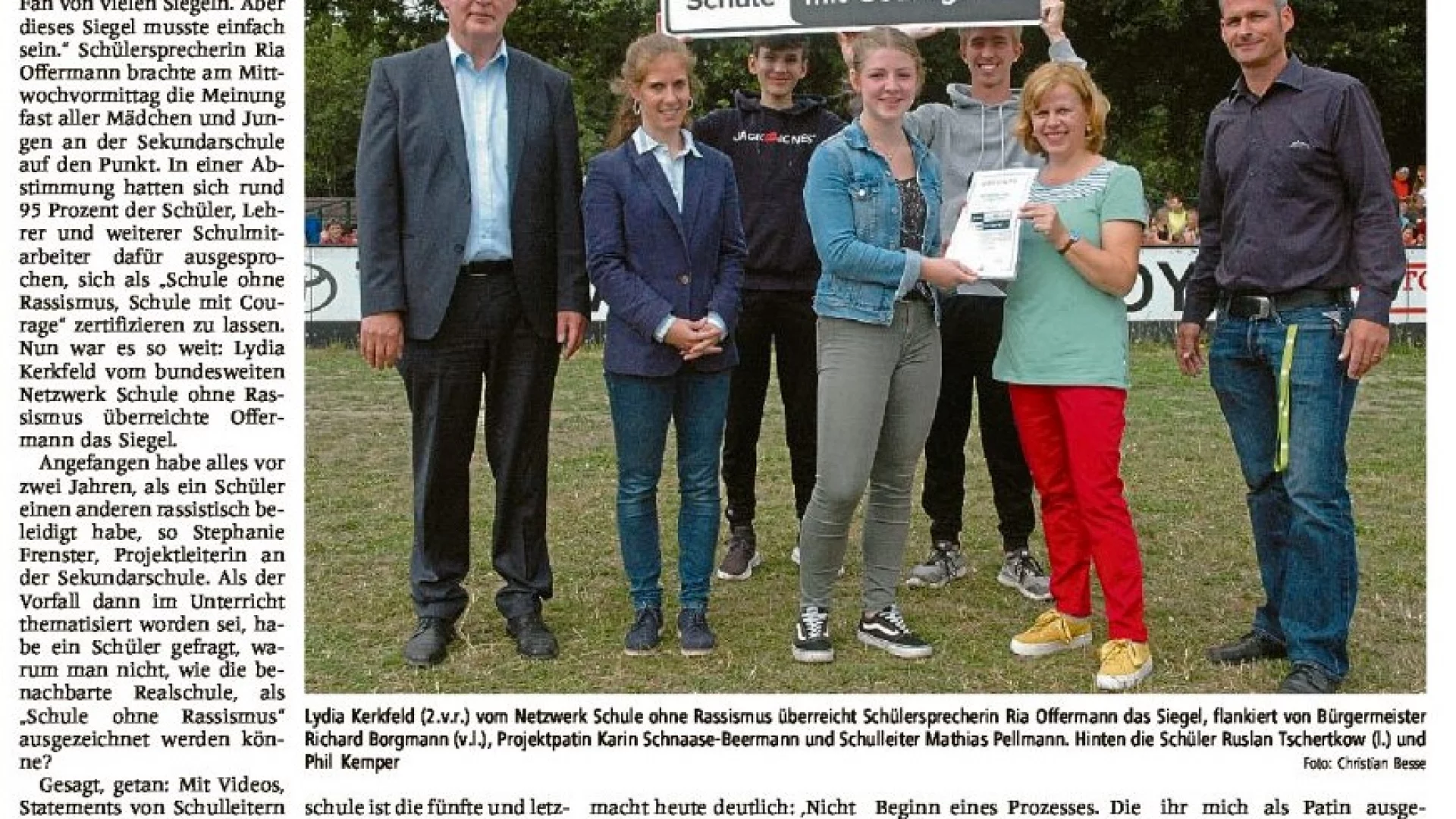 In einem Festakt im Rahmen des Sportfestes wurde die Sekundarschule Lüdinghausen in das Netzwerk "Schule ohne Rassismus - Schule mit Courage" aufgenommen. Nachdem die Schülervertetung mit SV-Lehrerin Stefanie Frenster sich im vergangenen Schuljahr intensiv mit dem Thema befasst hatte, wurde das Projekt in allen Klassen vorgestellt. Über 95% der Menschen in der Schulgemeinschaft haben sich im Anschluss dafür ausgesprochen, mit dem Beitritt zum Netzwerk ein Zeichen gegen Diskriminierung und Rassismus sowie für ein friedliches und respektvolles Miteinander zu setzen. Die Urkunde wurde von Lydia Kerkfeld vom Netzwerk "Schule ohne Rassismus" überreicht. Die Patenschaft für das Projekt hat Karin Schnaase-Beermann übernommen, die die Schule auch zukünftig in ihrem Engagement unterstützen wird.