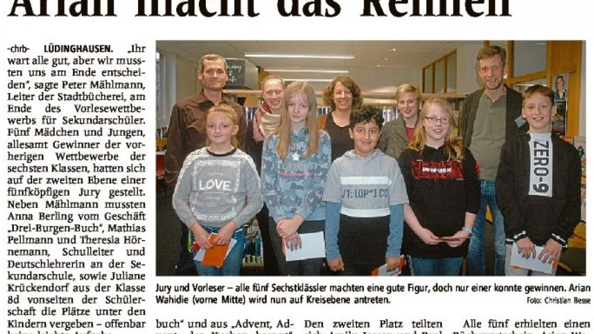 Am "Bundesweiten Vorlesewettbewerb des deutschen Buchhandels" unter Schirmherrschaft des Bundespräsidenten nehmen alljährlich etwa 600.000 Schülerinnen und Schüler teil. Die besten Leserinnen und Leser der 6. Klassen der Sekundarschule waren heute in die Stadtbücherei eingeladen, um den besten Leser der Schule zu ermitteln. Die Jury bestand aus dem Leiter der Bücherei St. Felizitas, Peter Mählmann, Frau Berling von 3BurgenBuch, Juliane Krückendorf als Vertreterin der Schülerschaft, Deutschlehrerin Theresia Hörnemann und Schulleiter Mathias Pellmann. Zunächst lasen alle Klassensieger einen vorher eingeübten Text aus einem selbst gewählten Jugendbuch vor. Anschließend galt es, die Jury auch mit einem unbekannten Text durch gute Lesetechnik und Interpretation des Textes zu überzeugen. Unter vielen guten Vorleserinnen und Vorlesern setzte sich Arian Wahidie als Schulsieger durch. Er wird die Sekundarschule Anfang 2020 beim Vorlesewettbewerb auf der Kreisebene vertreten. Ein herzlicher Dank geht an Jutta Daldrup für die Organisation des Wettbewerbs.