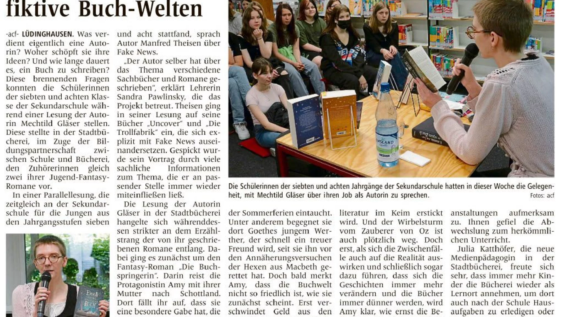 Schriftsteller zum Anfassen - wo gibt es das? In der Aula der Sekundarschule und in der Stadtbibliothek hatten die Schülerinnen und Schüler der Sekundarschule die Gelegenheit, prominente Autoren live zu erleben. Während Mechthild Gläser ("Die Buchspringer") in der Sadtbücherei aus ihren Werken las, kam Manfred Theisen ("Einfach erklärt: Social Media, Cybermobbing, Deine Daten im Web") in der Aula mit den Sekundarschülern ins Gespräch. Organisert wurden die Lesungen im Rahmen der Bildungspartnerschaft Bibliothek-Schule von Christiane Hoppe; finanziell unterstützt wird dieses tolle Projekt vom Förderverien der Sekundarschule.