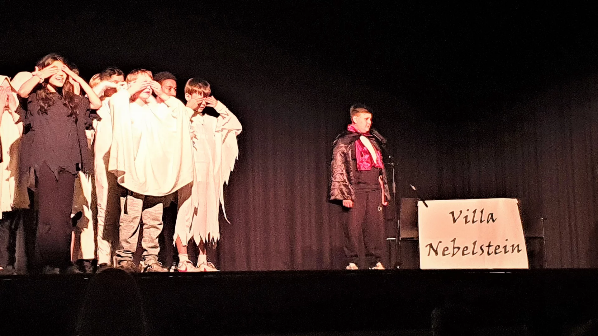 "Villa Spooky" heißt das Grusel-Musical, das die Klasse 5A mit dem Leitungsteam Sandra Altemöller und Sarah Sanders im Rahmen des Monatstreffs in der Aula der Sekundarschule aufgeführt hat. Das "Grusical" handelt vom Vampir Bissgurius, der seine Villa mit Hilfe seiner schaurigen Freunde vor dem Verkauf retten muss. Die Schülerinnen und Schüler begeisterten das Publikum mit ihrer Spielfreude und ihrem schauspielerischen und musikalischen Talent.