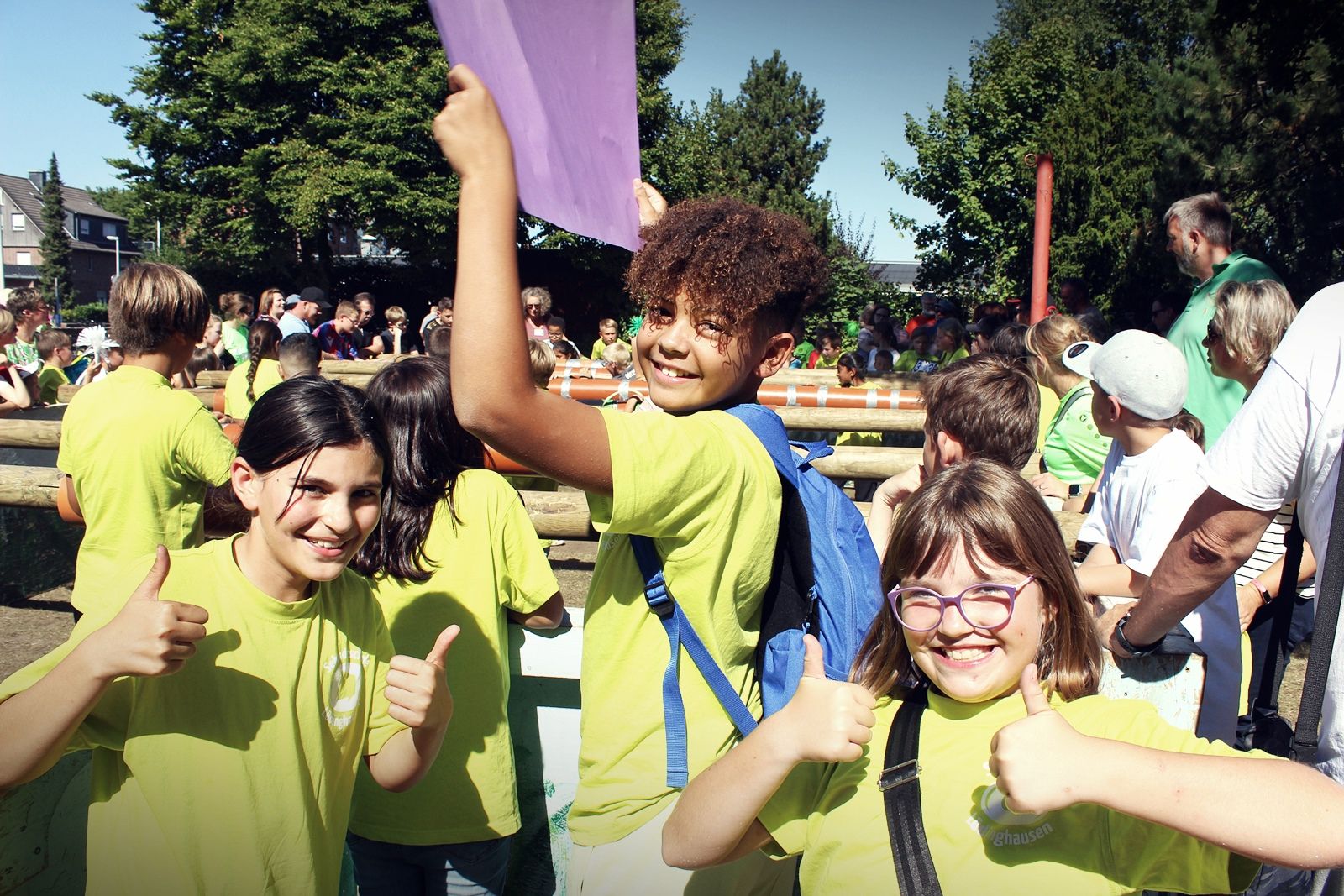 125 neue Schülerinnen und Schüler wurden am Mittwoch in die Schulgemeinschaft der Sekundarschule Lüdinghausen aufgenommen. Nach der Einschulungsfeier am Mittwoch fanden die ersten Schultage im Klassenverband statt, um sich und die neue Schule kennenzulernen. Am Freitagvormittag gab es einen Einschulungsgottesdienst in der Pfarrkirche St. Felizitas. Abschluss und Höhepunkt der ersten Schulwoche ist das Menschenkickerturnier am Freitagnachmittag, bei dem der Förderverein der Sekundarschule die neuen Schülerinnen und Schüler und ihre Familien begrüßt. Die neuen Schul-T-Shirts sind ein Willkommensgeschenk des Fördervereins.
