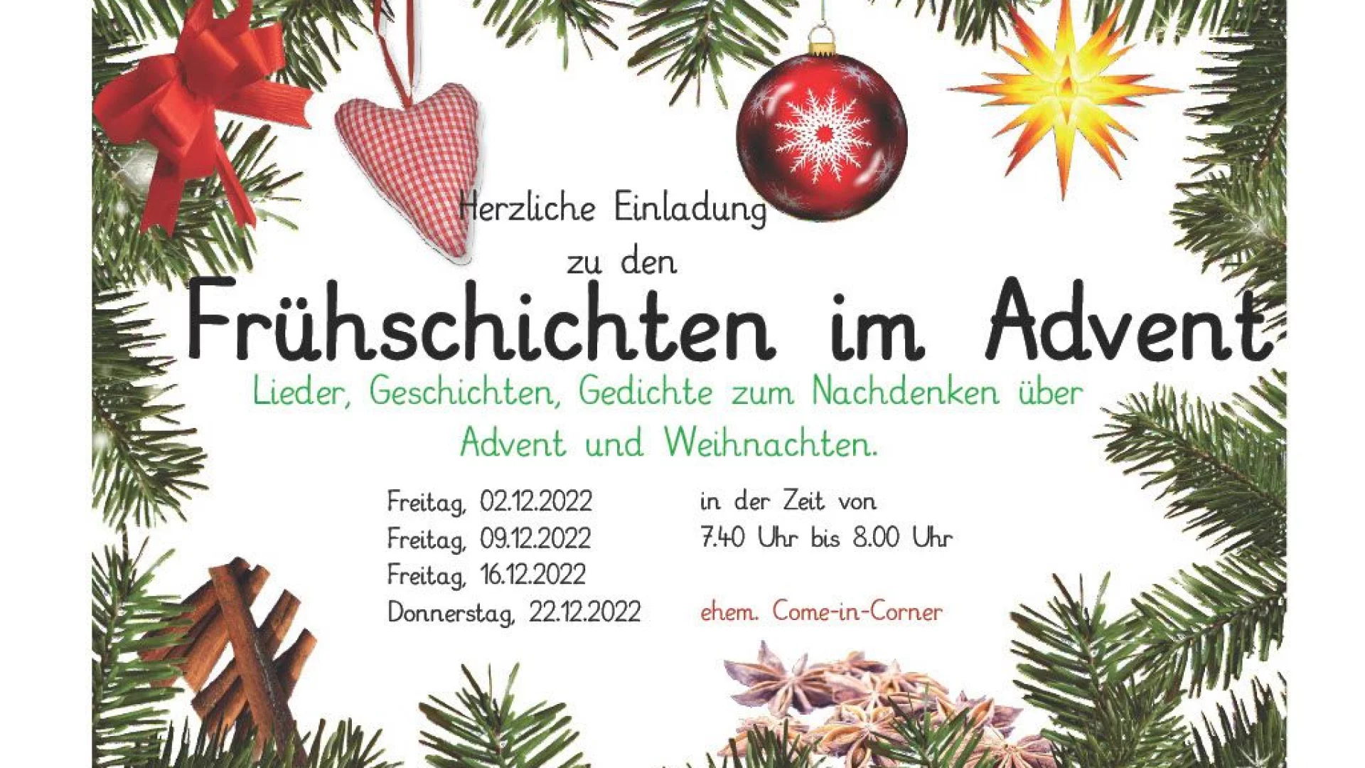 Im Advent sind alle Mitglieder der Schulgemeinschaft freitags vor Unterrichtsbeginn zur Frühschicht eingeladen. Mit Musik und Texten zum Advent stimmen wir uns auf Weihnachten ein. Menschen aller Religionen sind ebanso willkommen wie Menschen, die keiner Religion angehören. Das Team um Organisatorin Stephanie Frenster freut sich auf zahlreichen Besuch. Für weitere Informationen klicken Sie bitte auf das Bild.