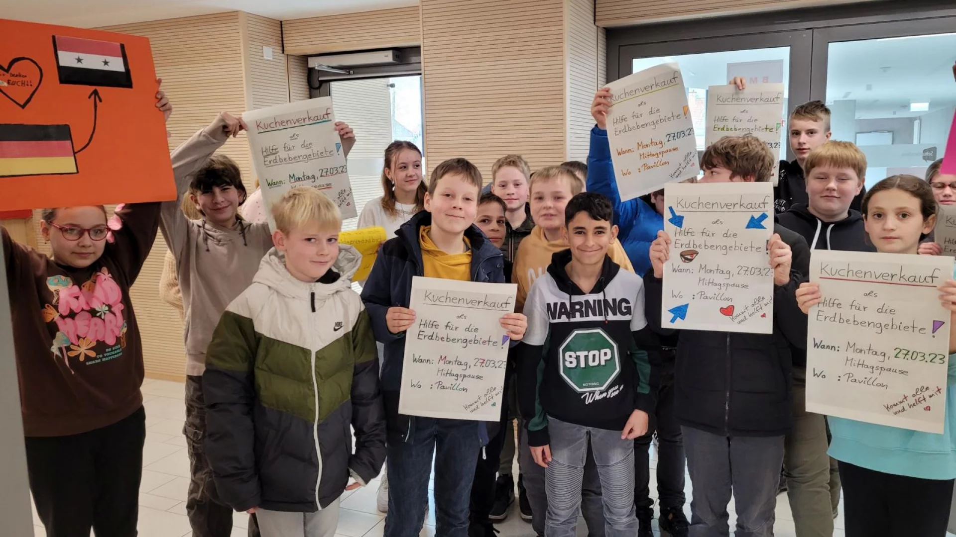 Nachdem die Klasse 6D in der Klassenstunde mit Frau Frenster und Frau Schulte-Vorwick das Erdbeben in der Türkei und Syrien thematisiert hatte, war schnell klar: Wir müssen helfen. Um den Menschen in Not zu helfen, verkauften die Schülerinnen und Schüler in der Mittagspause selbst gebackenen Kuchen, Muffins und Waffeln und baten die Kaufenden um Spenden. Mit Erfolg: Fast 300€ kamen zusammen. Das Geld wird jetzt an eine Hilfsorganisation gespendet. Vielen Dank, 6D!