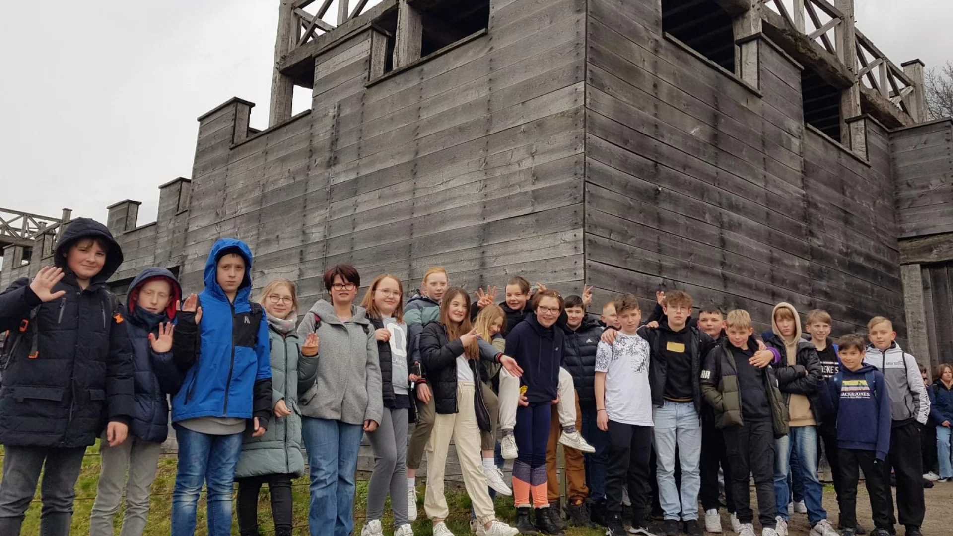 Aus dem Alltag eines Legionärs" hieß das Programm, welches die 6. Klassen der Sekundarschule im Rahmen der Unterrichtsreihe "Rom - vom Dorf zum Weltreich" im Römermuseum in Haltern besuchten. Hier konnten die Schülerinnen und Schüler hautnah erfahren, was es hieß, als Angehöriger einer römischen Legion in der Antike zu leben. An fünf Stationen erhielt man nicht nur viele Informationen, sondern konnte auch selbst aktiv werden. Die 125 Schülerinnen und Schüler konnten beispielsweise die 18 Kilogramm schwere Ausrüstung der Legionäre tragen, einen Feuerstein benutzen, in einem Zelt Rast machen und mit einer rekonstruierten Handmühle so Mehl mahlen, wie es die Römer im Feldlager taten. Das Bild zeigt die Klasse 6C vor dem am Originalstandort aufgebauten Westtor.