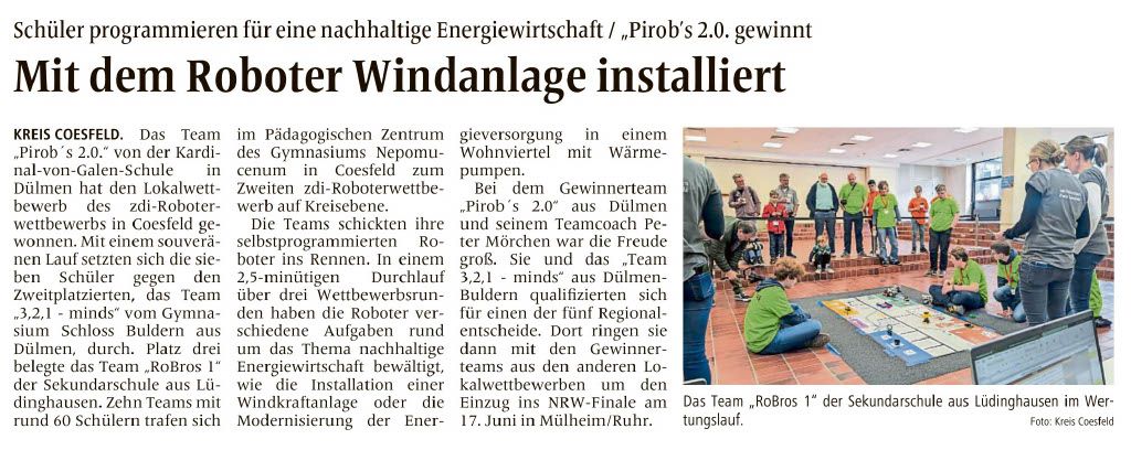 Mit zwei Teams war die Sekundarschule Lüdinghausen beim Robotik-Wettbewerb des zdi-Netzwerks (Zukunft durch Innovation) in Coesfeld vertreten. Die "RoBros" wurden zu diesem Anlass von Sponsor Max Pröbsting eigens mit Team-Shirts ausgestattet, die sie nachher mit nach Hause nehmen konnten. Begleitet wurden die Teams von Marcus Kunz (MINT-Koordinator) und Johannes Medding. Das Ergebnis kann sich mit Platz 3 und 4 sehen lassen. Im nächsten Jahr möchten die "RoBros" wieder teilnehmen und noch weiter auf oben auf dem Treppchen stehen.