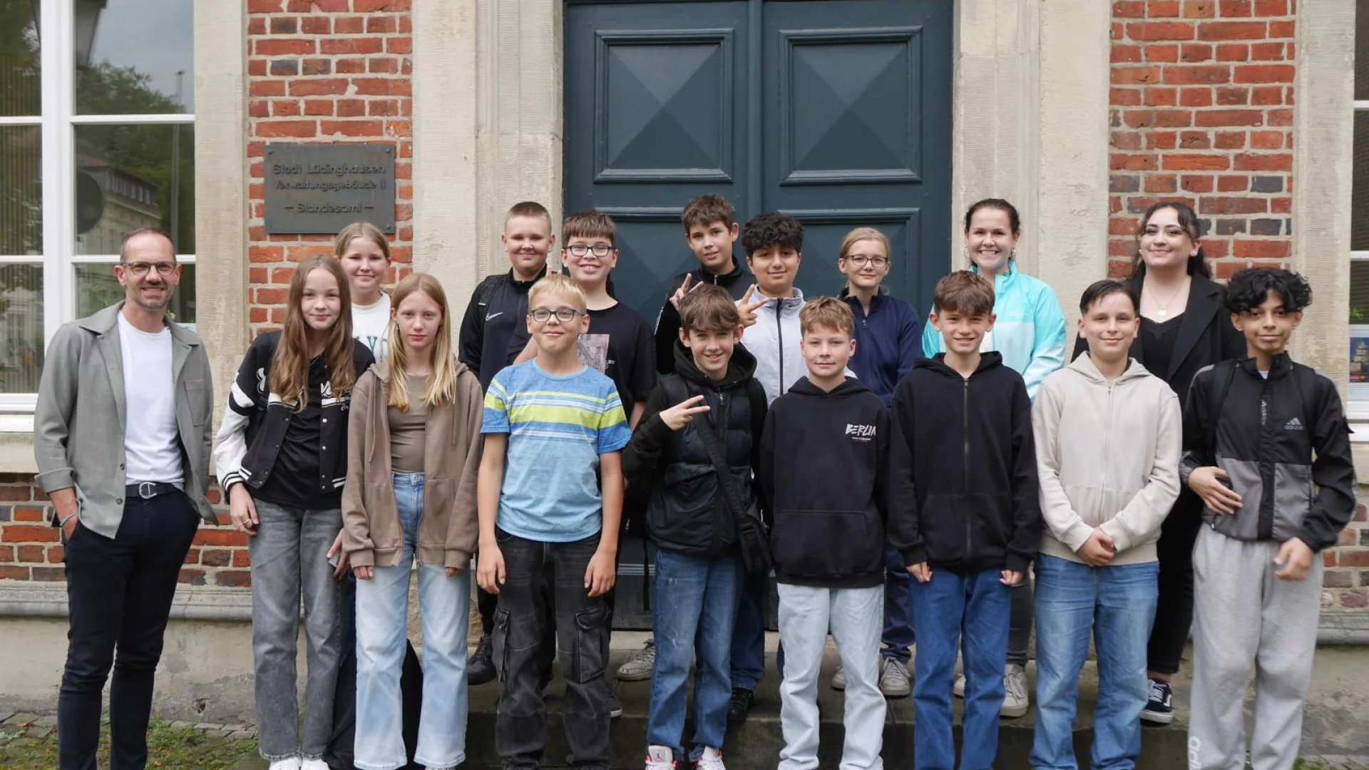 Am Montag hieß es für den Wahlpflichtkurs „Sozialwissenschaften“ des siebten Jahrgangs der Sekundarschule mit den Lehrerinnen Marie Probst und Merve Yildirim "raus aus dem Klassenzimmer und rein in das Rathaus", dort wo Politik gemacht wird. Denn an Politik sind die Schülerinnen und Schüler des Kurses sehr interessiert, besonders wenn es um ihre Stadt Lüdinghausen geht. Und am besten weiß natürlich der Bürgermeister Ansgar Mertens über das politische Geschehen der Stadt Lüdinghausen Bescheid und so nahm sich Ansgar Mertens Zeit für die vielen Fragen der Kinder. Besonderes Interesse hatten die Schülerinnen und Schüler an dem Bau des neuen Schwimmbades und freuten sich sehr, dass ihnen der Sprungturm des Klutenseebades erhalten bleibt. Interessiert zeigten sich die Kinder auch an den Aufgaben des Bürgermeisters und befragten Herrn Mertens über seine Zukunftsvorstellungen für Lüdinghausen. Ein neues Basketballfeld und neue Umkleiden für das Stadion stießen auf große Begeisterung. Auch über Fußball wurde heiß diskutiert und zur Freude vieler Schülerinnen und Schüler outete sich Herr Mertens als Bayernfan. Zum Schluss wurden noch Selfies mit dem Bürgermeister gemacht.