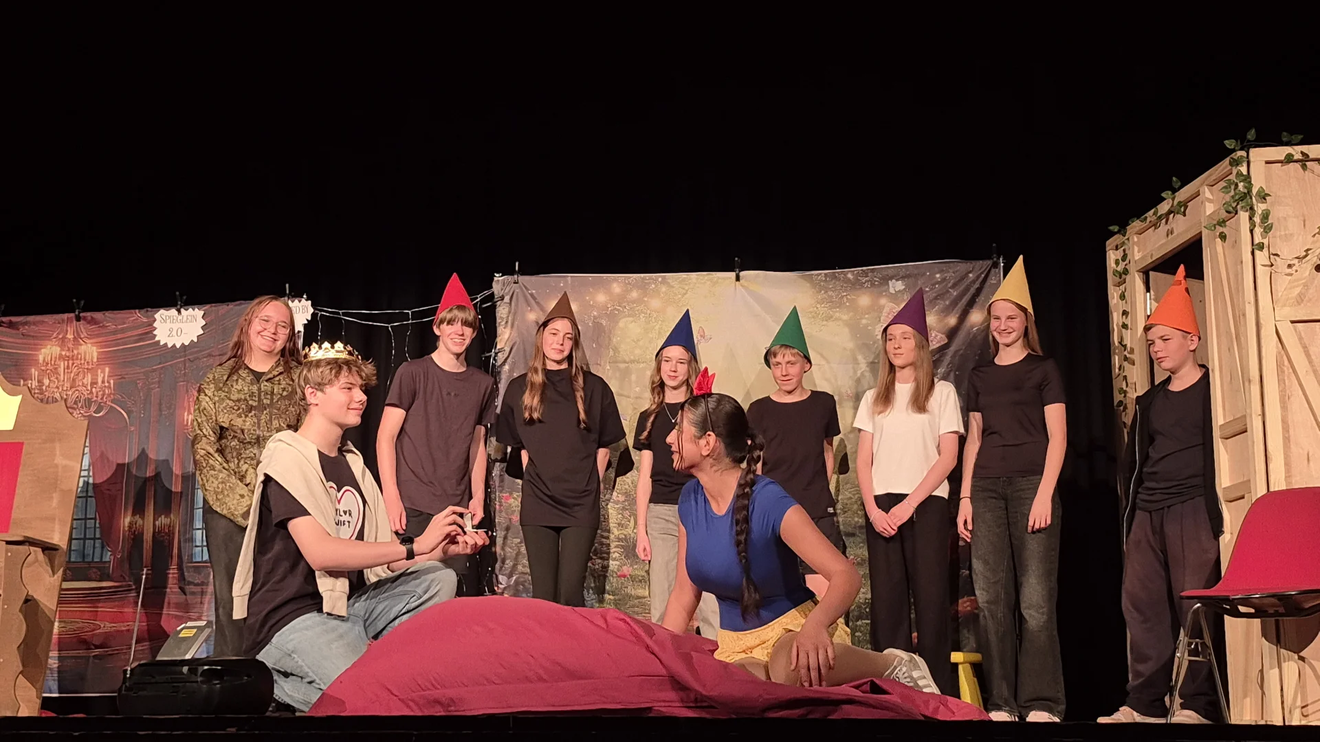 Eine moderne Interpretation des Schneewittchen-Themas zauberte der Darstellen&Gestalten-Kurs der Jahrgangsstufe 8 unter der Leitung von Kristina Haas auf die Bühne. Hier wurde Siri gefragt, wer die Schönste im Land sei, der Vergiftungsversuch erfolgte mit Pizza und der Prinz versuchte, Schneewittchen mit Musik von Taylor Swift wieder zum Leben zu erwecken. Die Schülerinnen und Schüler begeisterten das Publikum nicht nur mit ihrer Spielfreude, sondern auch mit liebevoll gebauten Requisiten und dem stimmigen Einsatz von Bühnentechnik.
