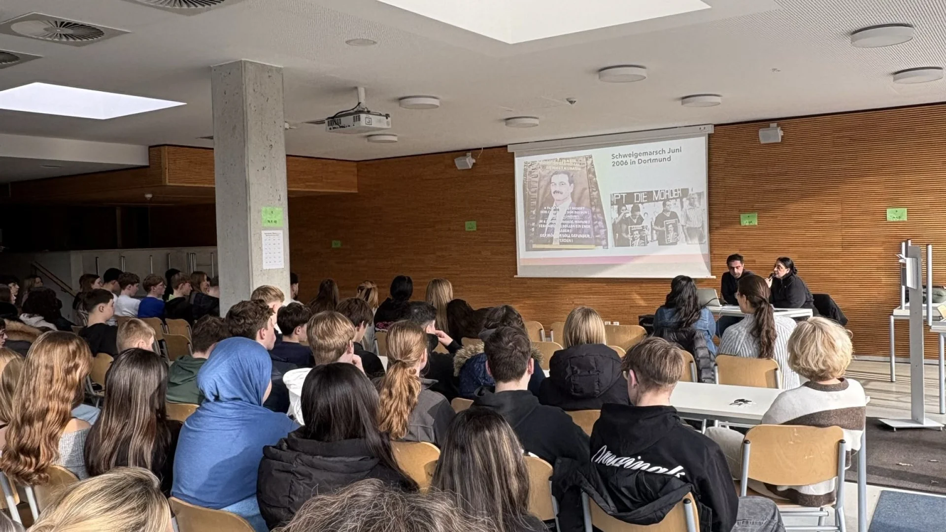 Im Gespräch der beiden erfuhren die Schülerinnen und Schüler die Geschichte der Familie Kubaşık nach der politisch motivierten Flucht in den 1990er Jahren bis zum Mord am Familienvater am 04.04.2006.
