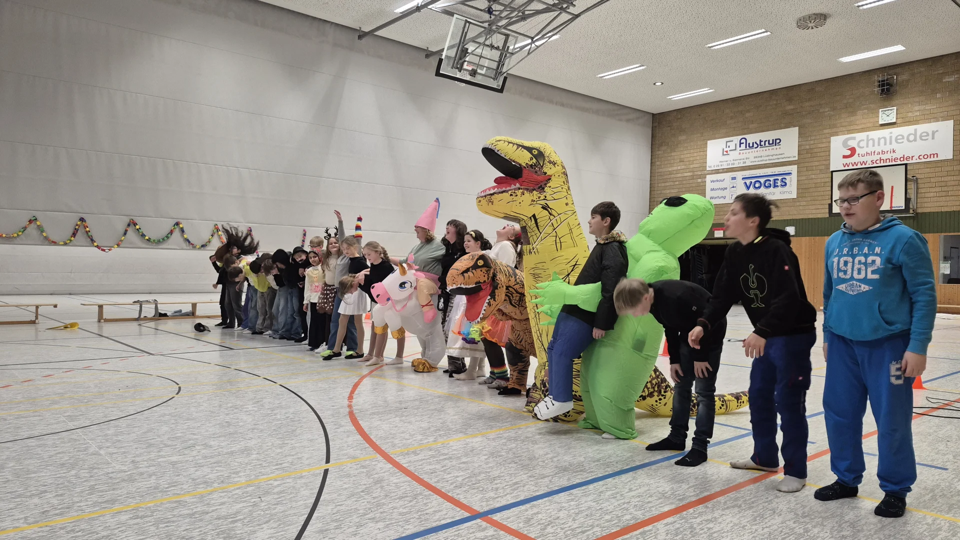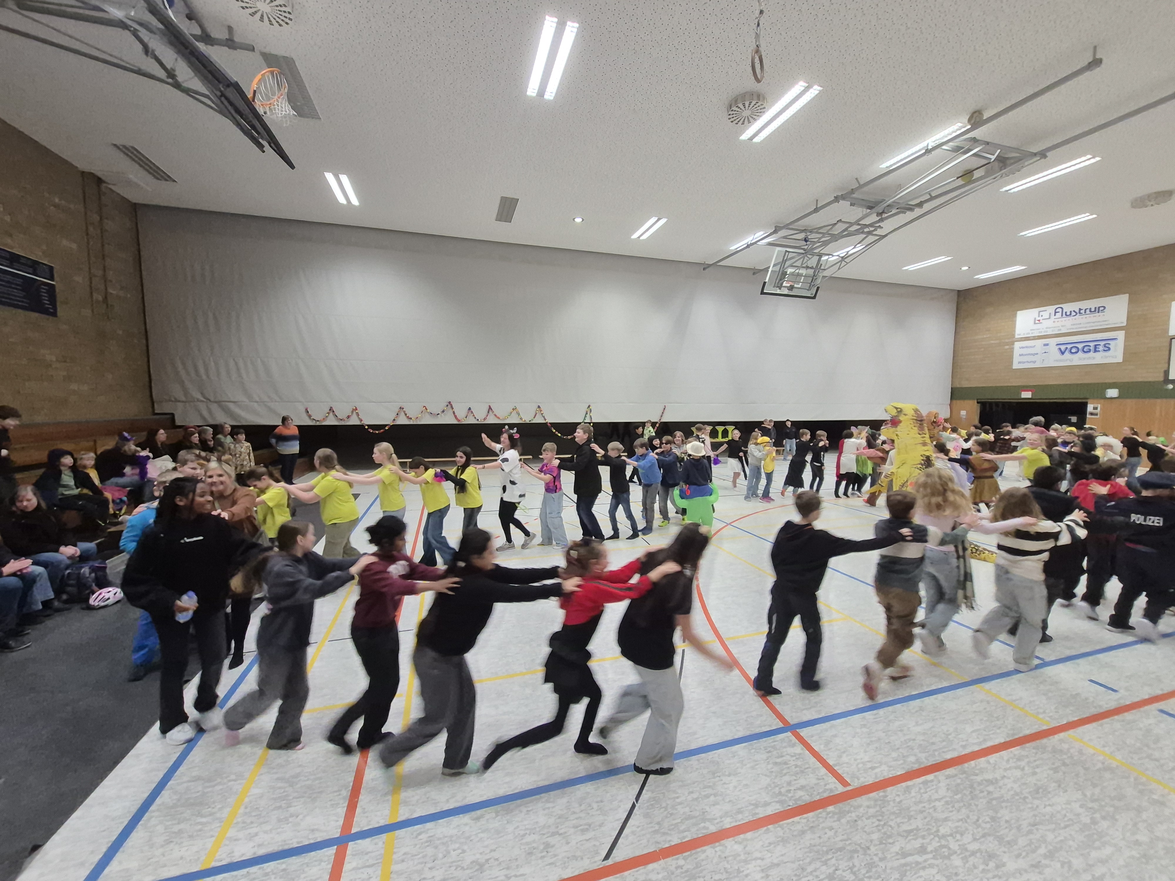 Zu einer besonderen Karnevalsfeier hatten die Schülerinnen und Schüler der Jahrgangsstufe 5 ihre Eltern und weitere Gäste in die Sporthalle eingeladen: Jede Klasse hatte einige Darbietungen einstudiert, sodass ein buntes und fröhliches Karnevalsprogramm entstand. Ob Tanz, Musik, Sport, Theater, Sketch oder Kunst: Alle konnten sich in das abwechslungsreiche und mitreißende Programm einbringen. Zum Abschluss gab es eine Polonaise mit der ganzen Jahrgangsstufe, sodass auch draußen noch zu hören war: "Wir haben oben gute Laune, unten gute Laune. Vorne gute Laune, hinten gute Laune. Rechts gute Laune, links gute Laune. Gute Laune einfach überall."
