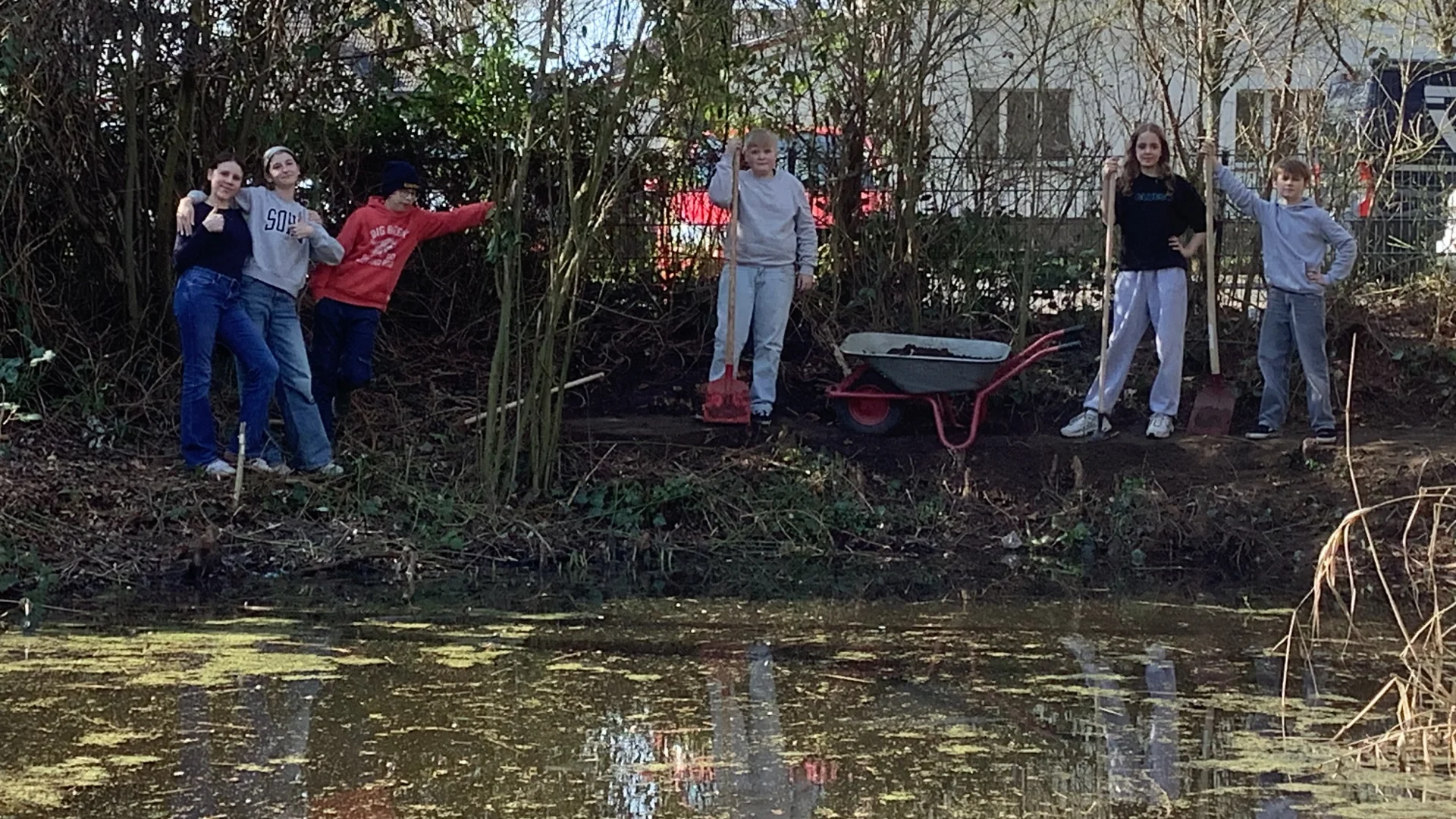 Es sprießt und blüht in unserem Schulgarten. Das Gartenteam unter der Leitung von Marcus Kunz war in den Mittagspausen sehr aktiv: Das Schilf am Teich ist zurückgeschnitten, Sträucher wurden beschnitten, ein Weg am hinteren Teil des Teichs wird angelegt. Fünf Sitzbänke wurden von einem Technikkurs gebaut und aufgestellt. Im Teich wurden zwanzig Goldfische ausgesetzt, wobei die Schülerinnen und Schüler sogar einen Teichmolch entdeckten.
